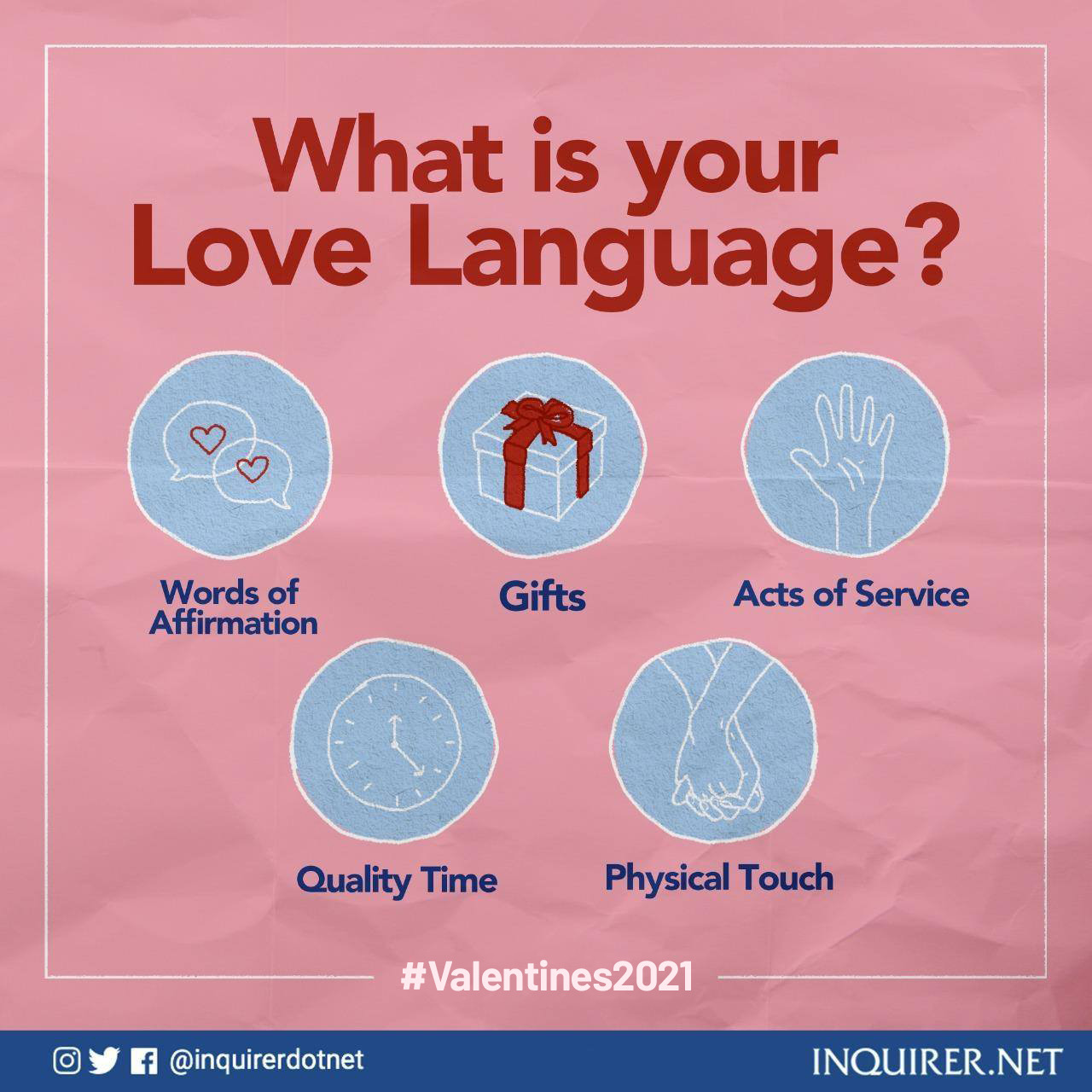 Inquirer On Twitter The Five Love Languages Are Five Different Ways Of Expressing And Receiving Love Words Of Affirmation Receiving Gifts Acts Of Service Quality Time And Physical Touch What Is Your